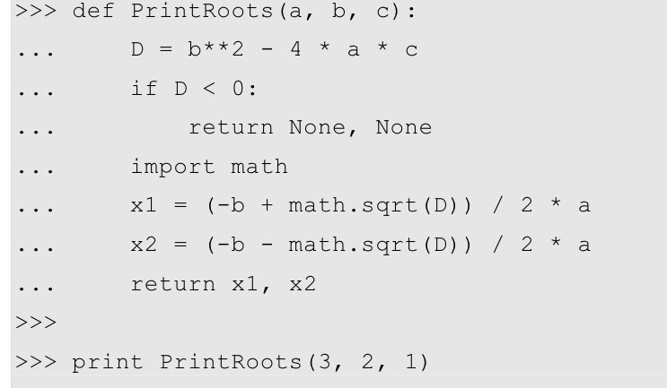 def PrintRoots(a, b, c): D = b**2 - 4 * a * c if D < 0: return None, None import math x1 = (-b + math.sqrt(D)) / 2 * a x2 = (-b - math.sqrt(D)) / 2 * a return x1, x2